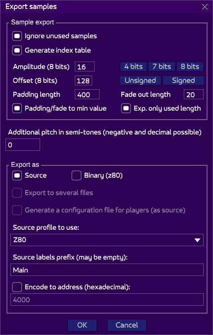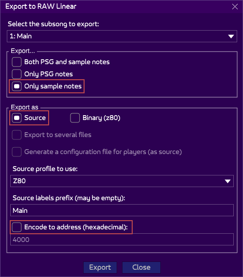 The “export only sample notes” is important because only the notes related to samples must be exported (the sample music sheet, if you will). Also, do not tick the “encode to address”.