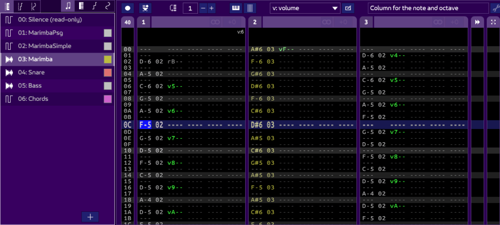 As you can see, the instrument 3 (Marimba) is a sample: it is directly used in the middle channel as any regular instrument.