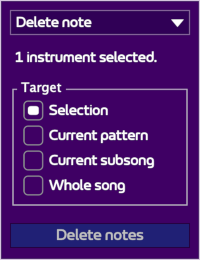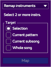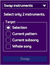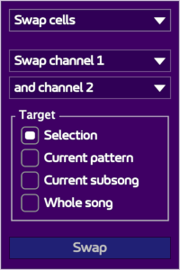 This toolbox allows to perform some operations on part of subsong(s), or their entire content. You will be able to transpose notes, remap, swap instruments, and more. Use the drop-down at the top to select the tool you want, and the display will adapt accordingly.