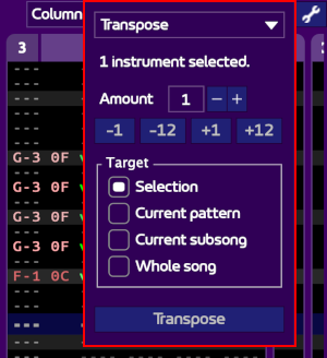 The target allows to chose what is transposed: your selection, the whole pattern, the current subsong, or the whole song.